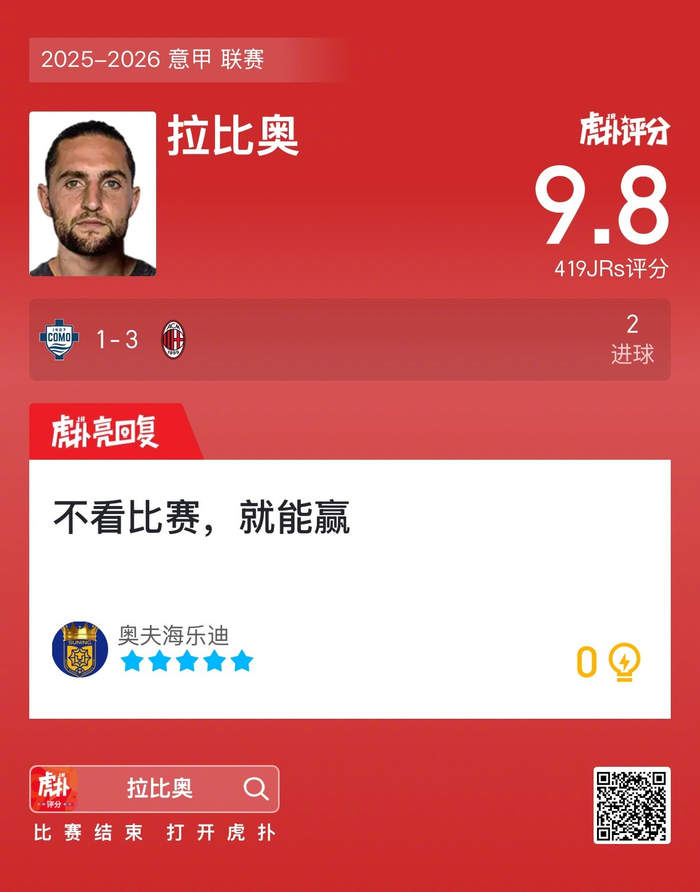 #科莫1比3ac米兰# 拉比奥打进两球,这表现你给几分?